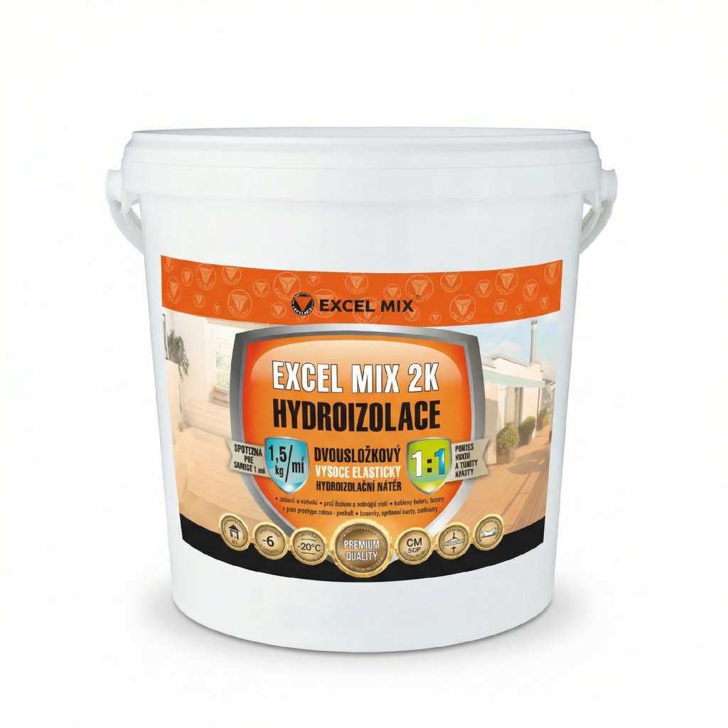 Excel Mix 2K Hydrostěrka je sada skládající se ze dvou částí: složky A (suchá cementová směs s plnivy) a složky B (tekutá disperze). Po jejich smíchání vznikne plastická hmota, která se snadno nanáší na stěny i podlahy. Po vytvrzení vytváří souvislou membránu, která nepropustí vodu k podkladu (beton, zdivo), ale zároveň umožňuje odvod vodních par (je paropropustná). Díky vysokému obsahu polymerů zůstává vrstva pružná i při střídání teplot, takže nepopraská ani na namáhaných místech, jako jsou terasy.