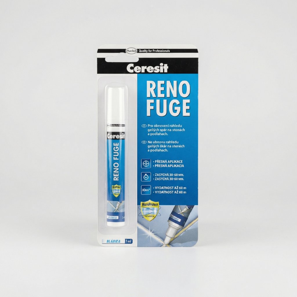 Ceresit RENO FUGE (7 ml) je speciální renovační pero pro okamžité obnovení vzhledu starých a zašedlých spár mezi obklady. Vrací spárám zářivě bílou barvu a díky ochranné technologii zabraňuje vzniku plísní. Jednoduchá a čistá aplikace formou fixu. Jedno balení vystačí až na 60 m délky (při šířce spáry 2 mm). Vhodné pouze pro cementové spáry.