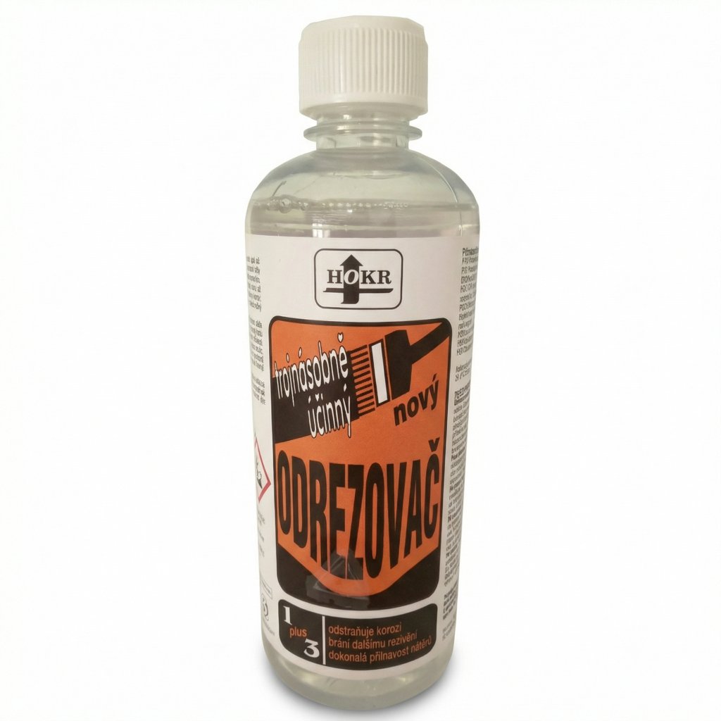 Zde jsou texty pro HOKR Odrezovač 1+3 (500 ml). Jedná se o oblíbený chemický přípravek, který usnadňuje práci s rezavým kovem. Klíčové je zdůraznit, že je bezoplachový a že rez chemicky přeměňuje na ochrannou vrstvu (neodstraňuje ji fyzicky pryč, ale stabilizuje ji).