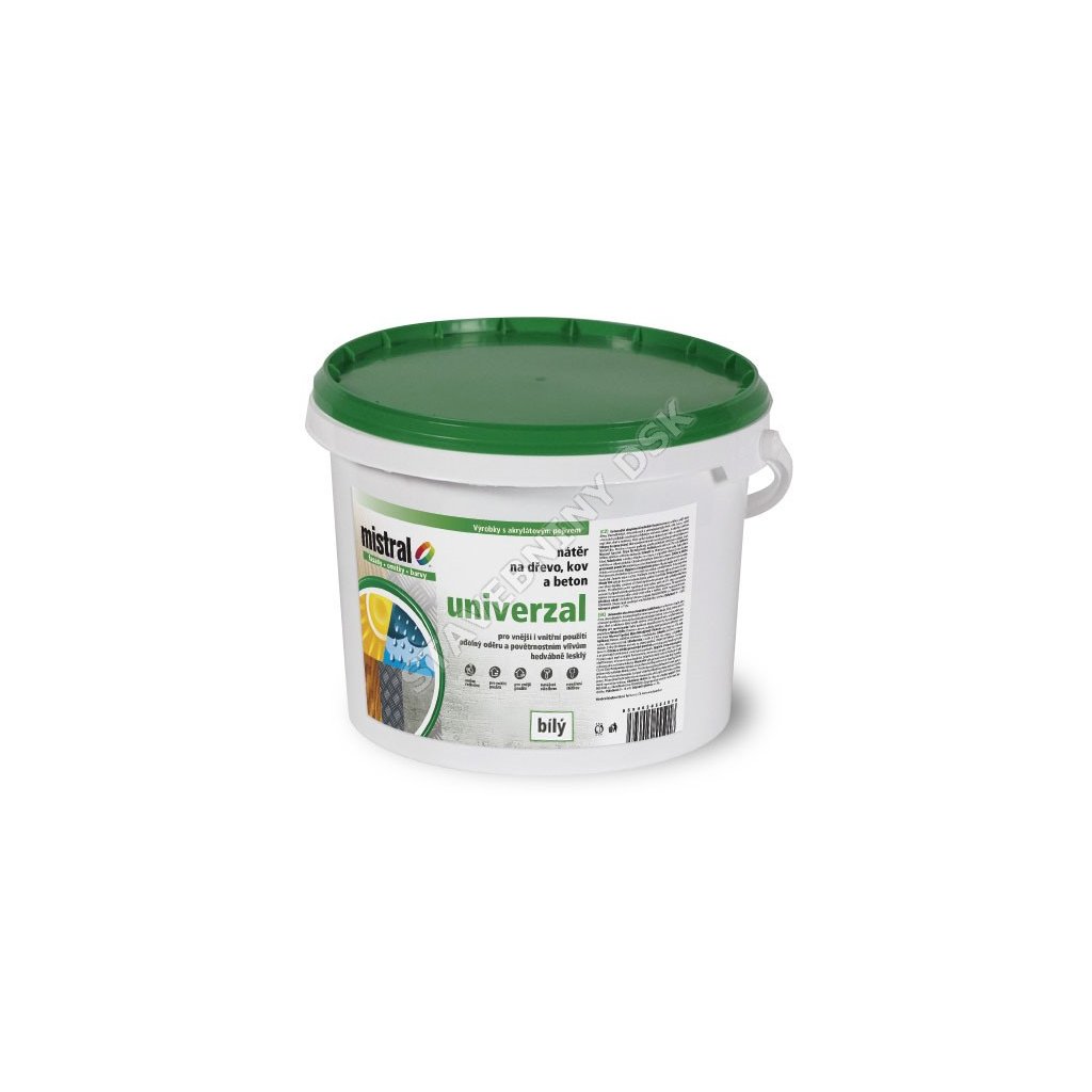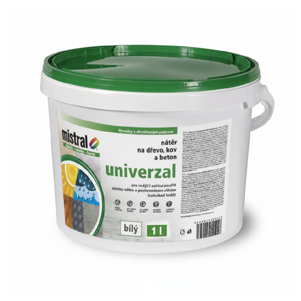 Mistral Univerzal – bílá je všestranná akrylátová barva, která vytváří trvale matný až pololesklý nátěr, odolný otěru i při vlhkém čištění (třída 1 podle ČSN EN 13 300). Přilne spolehlivě k různým podkladům – omítkám, zdivu, sádrokartonu, betonu, dřevu i kovu (s antikorozním základem) a díky UV stabilnímu složení nežloutne a odolá teplotám až do 65 °C. Je vhodná pro obytné i komerční prostory, jako jsou chodby, kuchyně, nemocnice či školy, kde se vyžaduje snadná údržba a odolnost proti čištění.