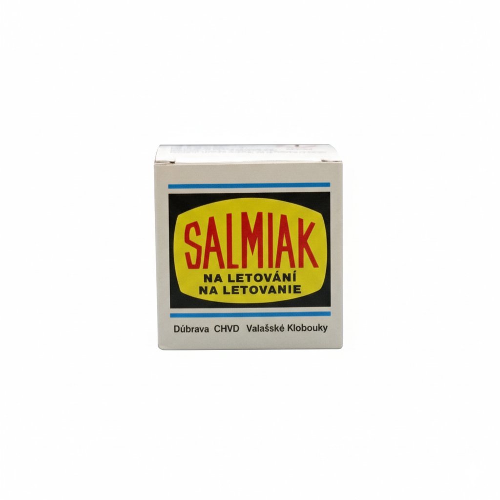 Salmiak (chemicky chlorid amonný) je krystalická látka slisovaná do tuhého bloku, která slouží k údržbě pájecího nářadí, zejména měděných hrotů. Při kontaktu s horkým hrotem dochází k sublimaci a chemické reakci, která rozpouští oxidy kovů (měděnku) a spálené zbytky tavidel. Tento proces je klíčový pro tzv. "pocínování" hrotu. Pokud je hrot zoxidovaný, cín na něm nedrží a tvoří kuličky. Po očištění na salmiaku se pájka krásně rozlije po celém povrchu hrotu, což zajistí maximální tepelnou vodivost a kvalitní spoj. Výrobek je určen pro měkké pájení v klempířství, elektrotechnice a jemné mechanice.