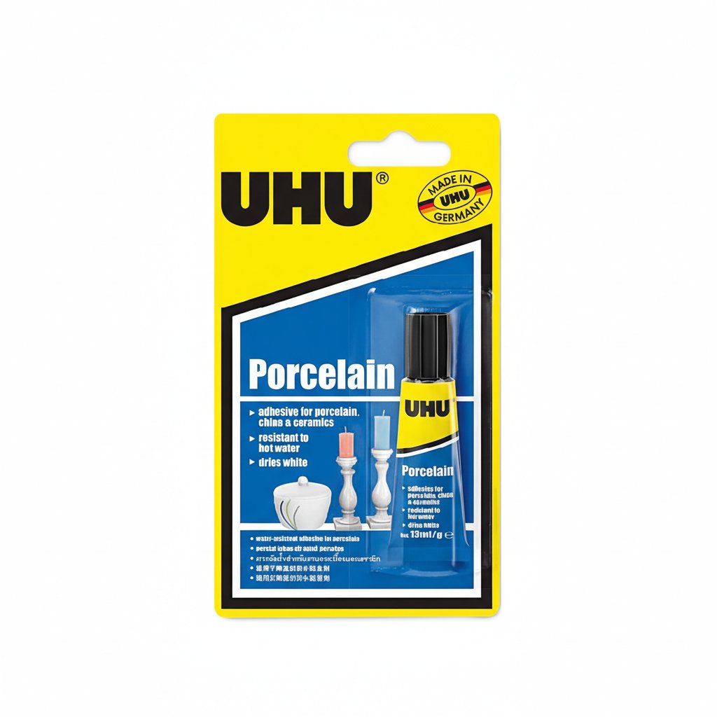 UHU Porcelán je speciální bílé lepidlo určené pro lepení, tmelení a opravy porcelánu, mramoru, kameniny a keramiky. Je řešením pro náročné opravy, kde nestačí jen pevnost spoje, ale záleží i na estetice. Na rozdíl od vteřinových lepidel má toto lepidlo vyšší hustotu a bílou barvu, díky které dokáže vyplnit chybějící střípky a praskliny. Po vytvrzení získá tvrdost podobnou keramice. Lepidlo je vysoce odolné vůči stárnutí a především vůči vysokým teplotám a horké vodě, takže opravené nádobí lze při šetrném zacházení běžně mýt.